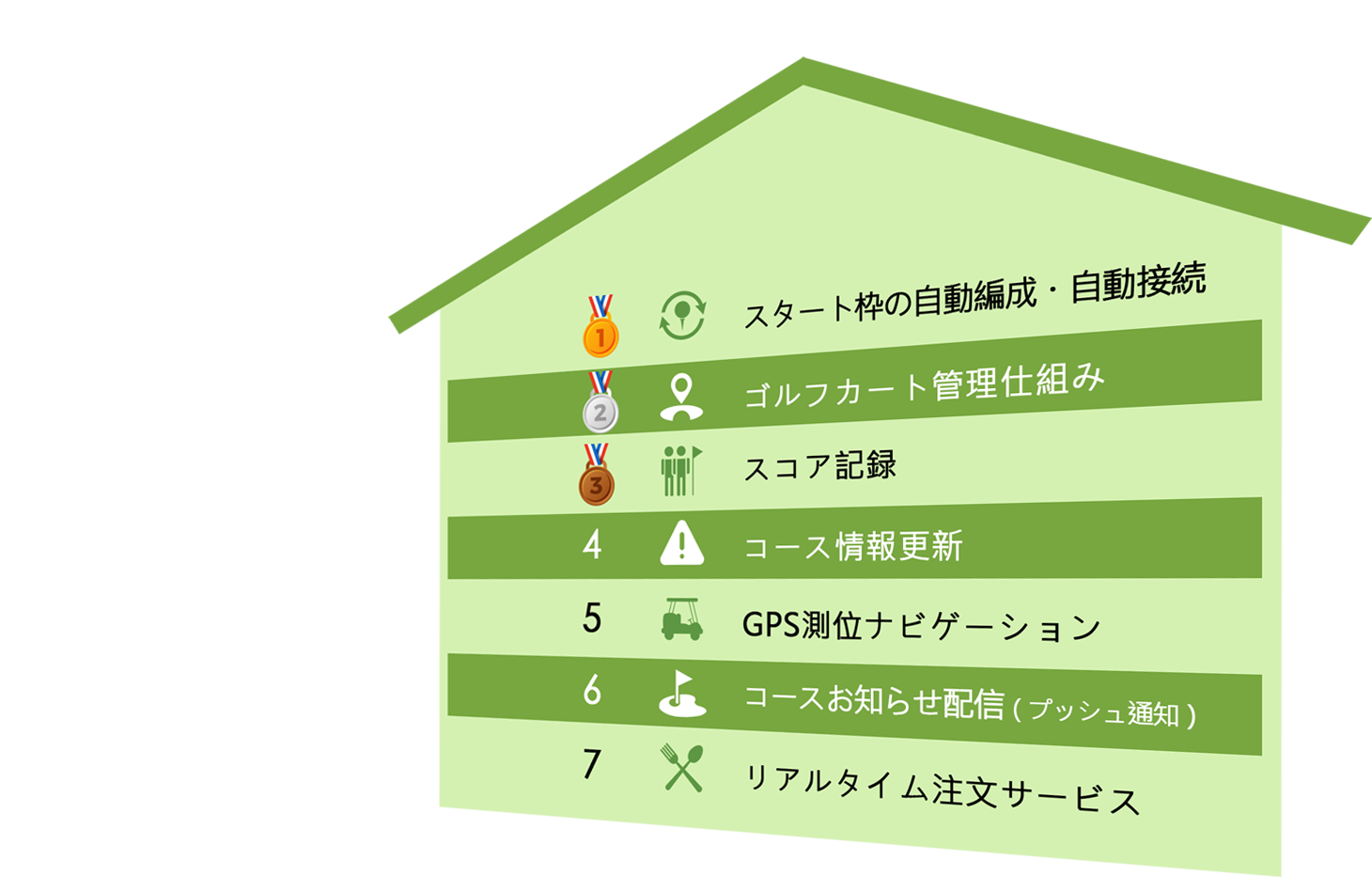 ゴルフカート端末から個人スコアデータを入力し、打球後にスコアを印刷したり、クラウドシステム管理に より個人の手持ちスマートフォンと連携し、その日の打球スコアをプッシュ通知することができます。
