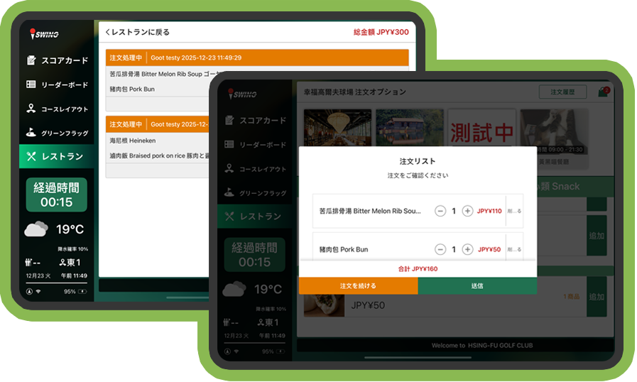 球車屏幕終端提供點餐功能,球員只需要輕輕觸碰,會館販賣部將會立即收到點餐資訊,並在最短的時間當中將餐點送達您所在的位置。