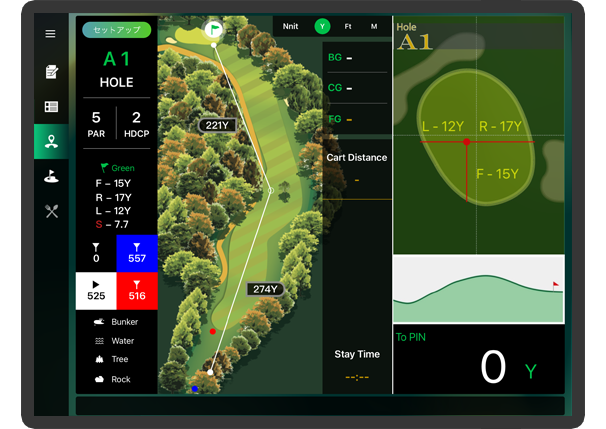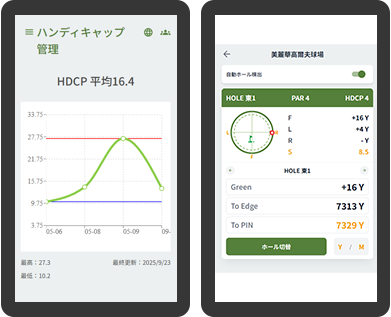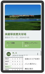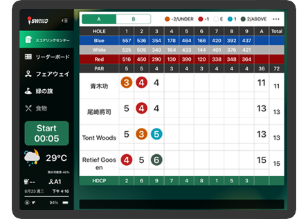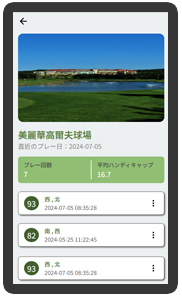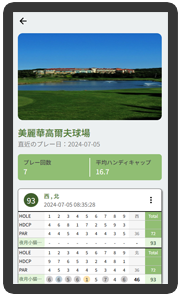 ゴルフカート端末から個人スコアデータを入力し、打球後にスコアを印刷したり、クラウドシステム管理に より個人の手持ちスマートフォンと連携し、その日の打球スコアをプッシュ通知することができます。